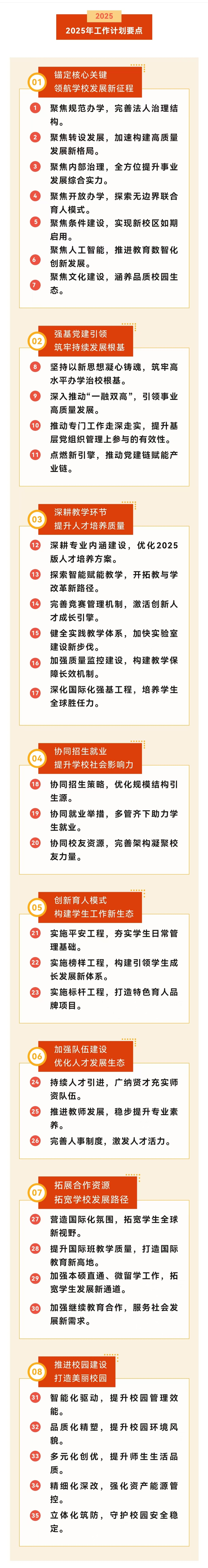理事长曹忠葆在会上发表重要讲话中指出,我们要以党中央、国务院颁布实施的《教育强国建设规划纲要(2024—2035年)》(以下简称“纲要”)为统领,深入贯彻“高端化、全球化、个性化”的发展战略和“数智、共创、向上”的年度主题词,坚持“文化引领、创新驱动、内涵发展、开放办学”的发展思路,勇于破局、勇挑重担,推动学校各项事业迈上新的台阶。针对学校建设和发展的重点任务,他从三大方面提出了要求:
