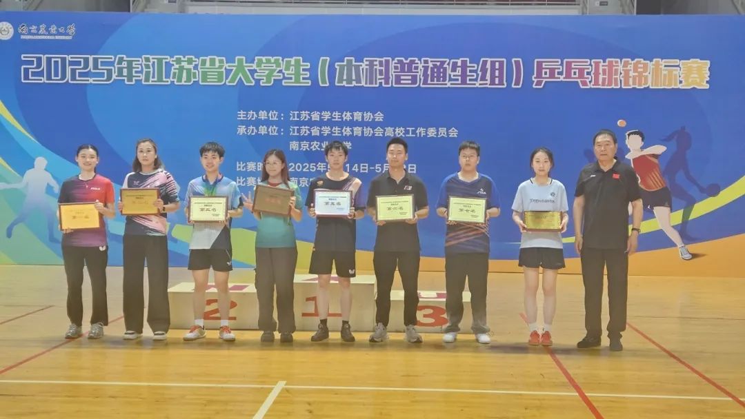 5月14日至18日,2025年江苏省大学生(本科普通生组)乒乓球锦标赛在南京农业大学圆满落幕。本届赛事汇聚全省46所高校的460余名运动员同台竞技,竞争激烈程度再创新高。我校乒乓球队在领队任翔、主教练毛佳佳的带领下表现亮眼:翟骏桐与胡以宁组合勇夺混双冠军,翟骏桐、胡以宁分获男女单打第六名,男双(张涵/翟骏桐)、女双(胡以宁/俞佳玉)分列第六和第四名,男团、女团则斩获第三名与第六名,最终以团体总积分第二名的优异成绩圆满收官。值得一提的是,我校成为本届赛事唯一一所所有参赛项目均挺进八强的院校,展现出全面均衡的竞技实力。