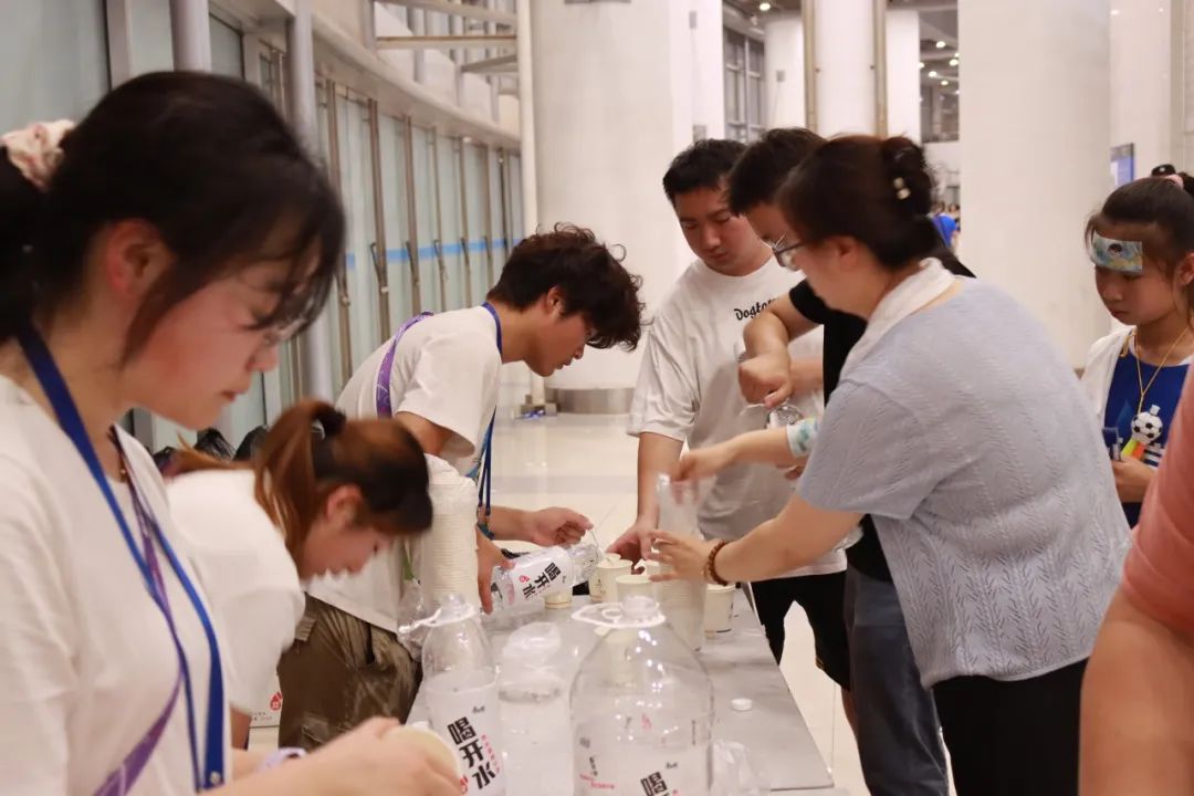 人文社科学院翻译专业2024级学生尹思雨于补给站前专注服务。她将一杯杯矿泉水稳稳送至观众手中,为观众送上一份清凉。