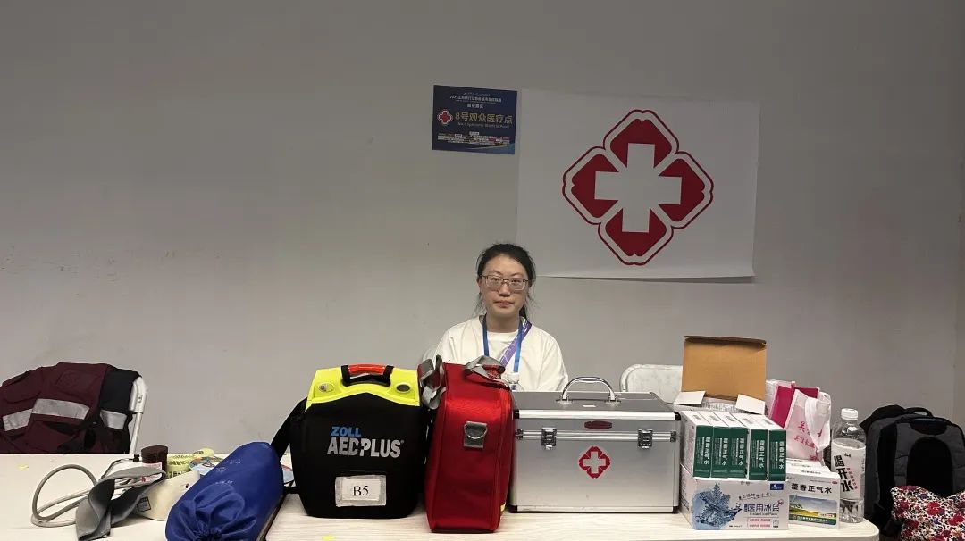 航空运输与工程学院工商管理专业2022级学生周伟与艺术与传媒学院广播电视编导专业2022级学生钱姝萌,组成7号医疗保障点的“黄金搭档”。